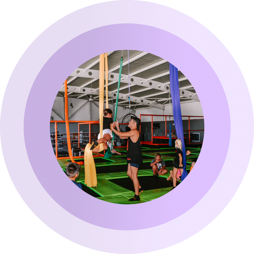 A partir de 21 niños el grupo se divide en 2 equipos, uno de los cuales salta en trampolines mientras que el segundo juega Bubble pool. Luego, los grupos se intercambian.